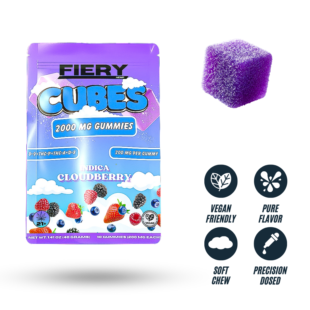 Fiery’s Cloudberry Cubes gummies are a magnificent symphony of mixed berry flavor packed with blueberries, blackberries, raspberries, and strawberries they are the sweetest out of the bunch. Start with 1/2 a gummy and they will be sure to put your head in the clouds.