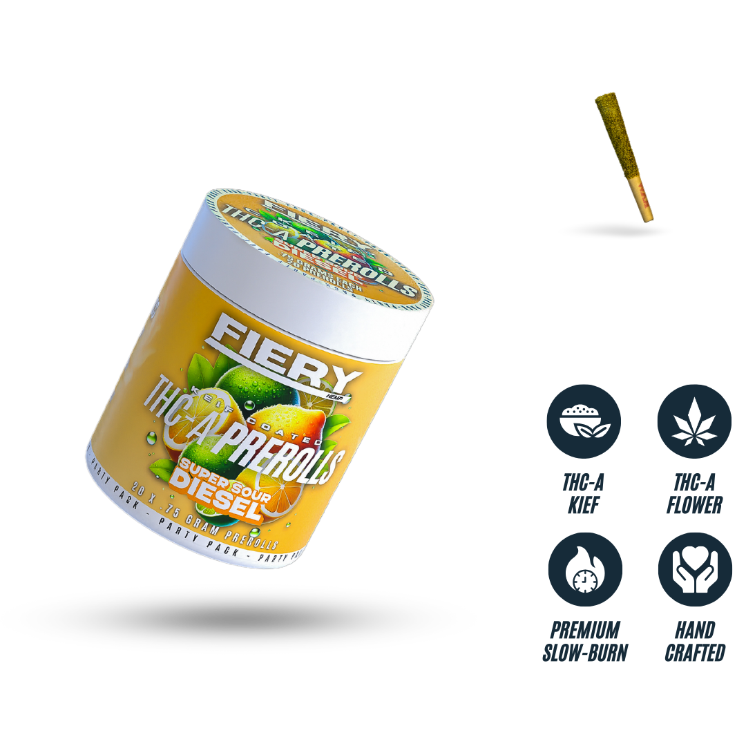 Pucker up before embracing the gassy, lemon, and citrus notes of Fiery’s uplifting Super Sour Diesel Party Pack prerolls. Each preroll integrates top tier THC-A flower with a THC-A kief coating.